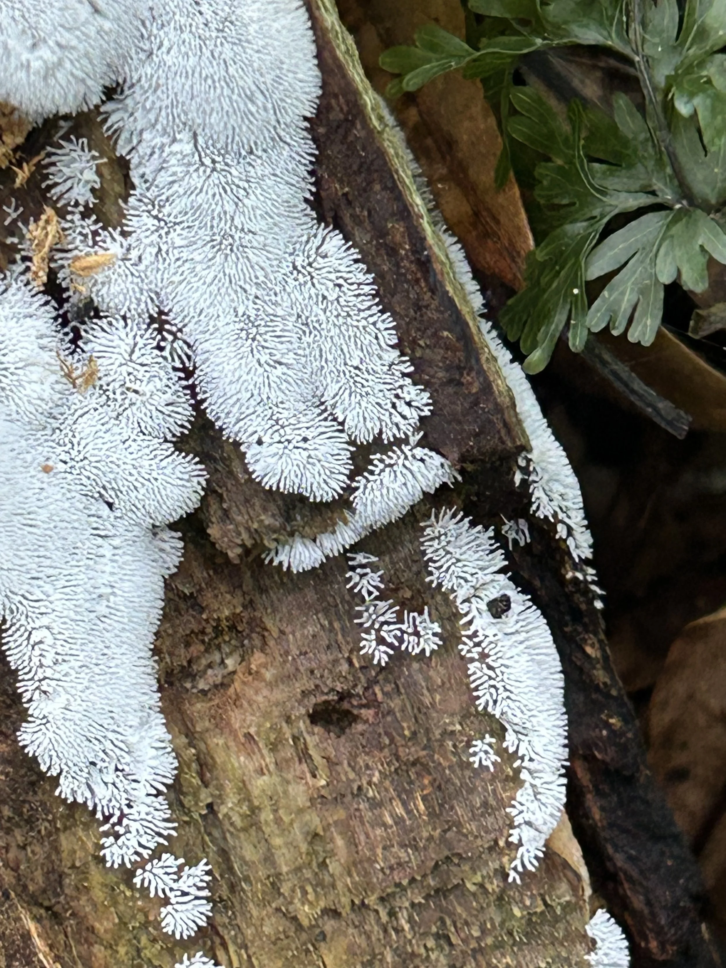 Above are different stages of Common Coral Slime Ceratiomyxa fruticulosa seen on different parts of the same rotting stump.